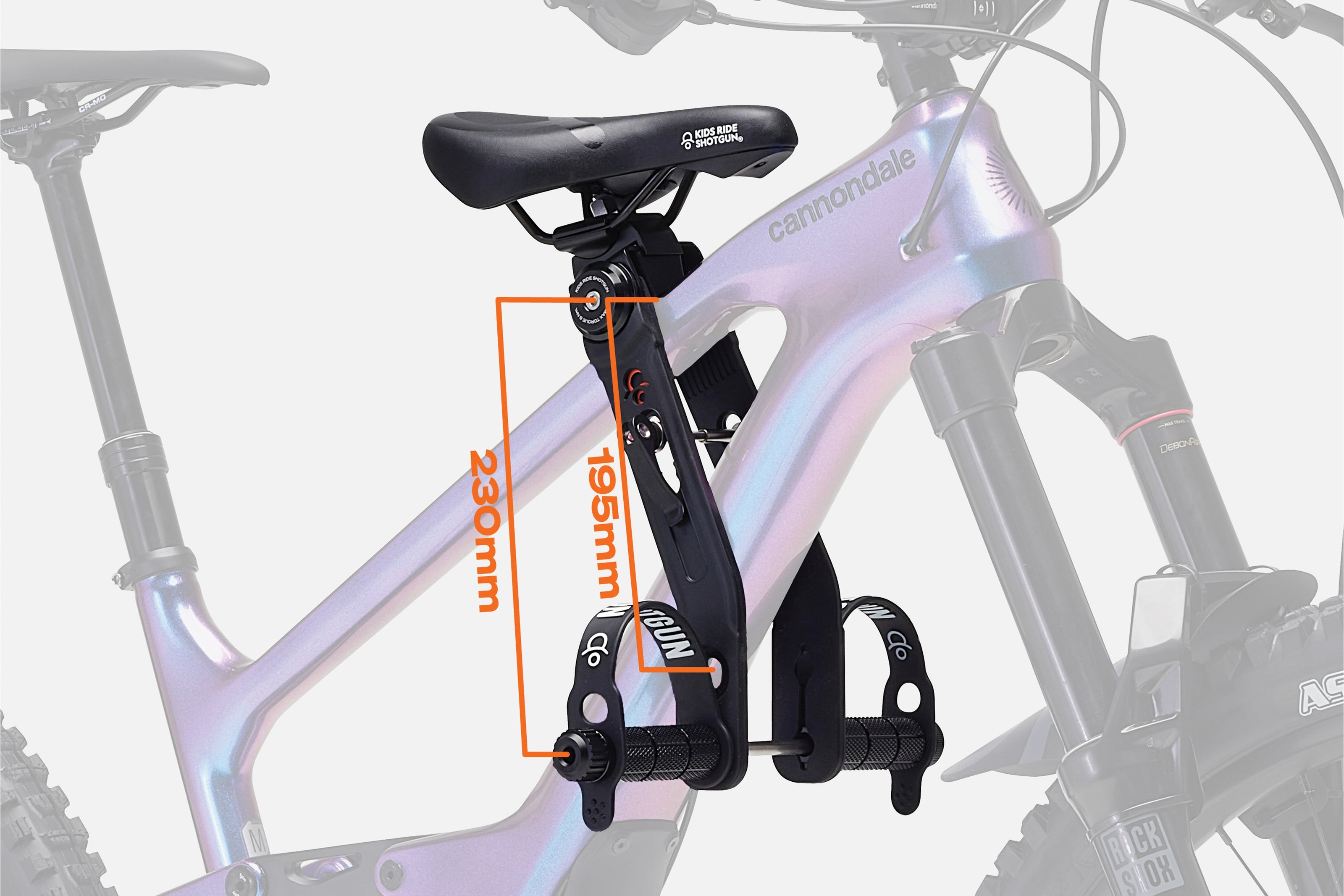 The Shotgun seat fits over the top of your top tube, and secures underneath your bottom tube. The max distance between the top tube and bottom tube of your bike where the shotgun seat mounts can not exceed 195mm if using the top axle position, or 230mm if using the lower axle position.