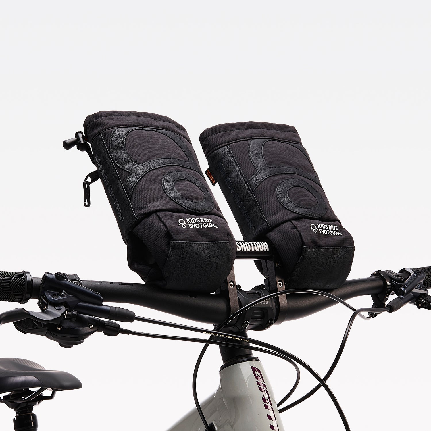 Our kids pogies are designed for use with Shotgun Pro handlebars and are made for winter rides, cold mornings – or even snow!